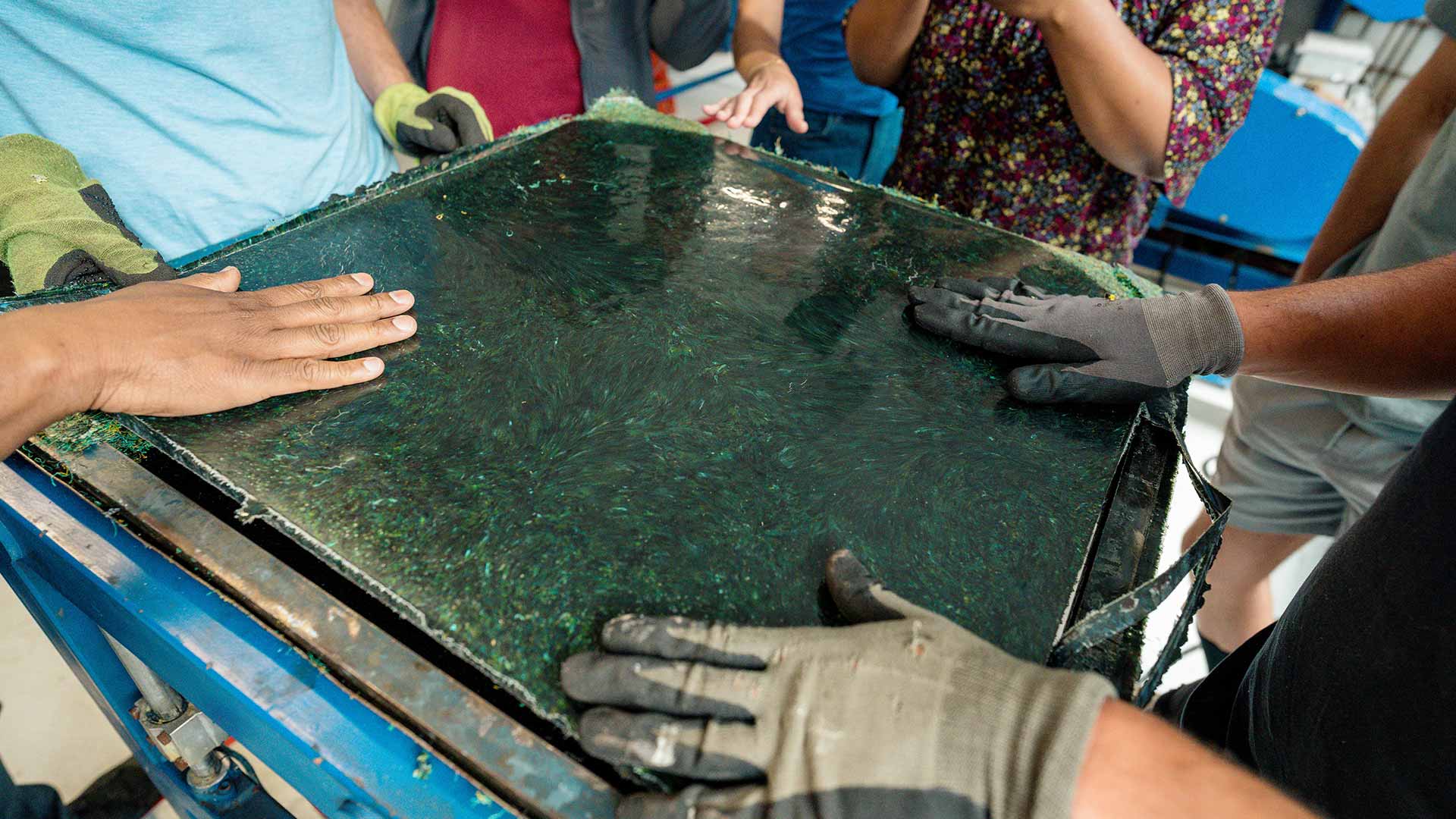 Les temps d’échange en conférence room ont alterné avec des séquences pratiques dans l’atelier de recyclage embarqué. Tri des plastiques, broyage, extrusion : les participants ont suivi l’ensemble des premières étapes de transformation de la matière. Un prototype de plaque en plastique recyclé, réalisé à partir de filets de pêche broyés apportés par l’un des entrepreneurs incubés, a servi de support à des tests de faisabilité, notamment pour des usages en mobilier.